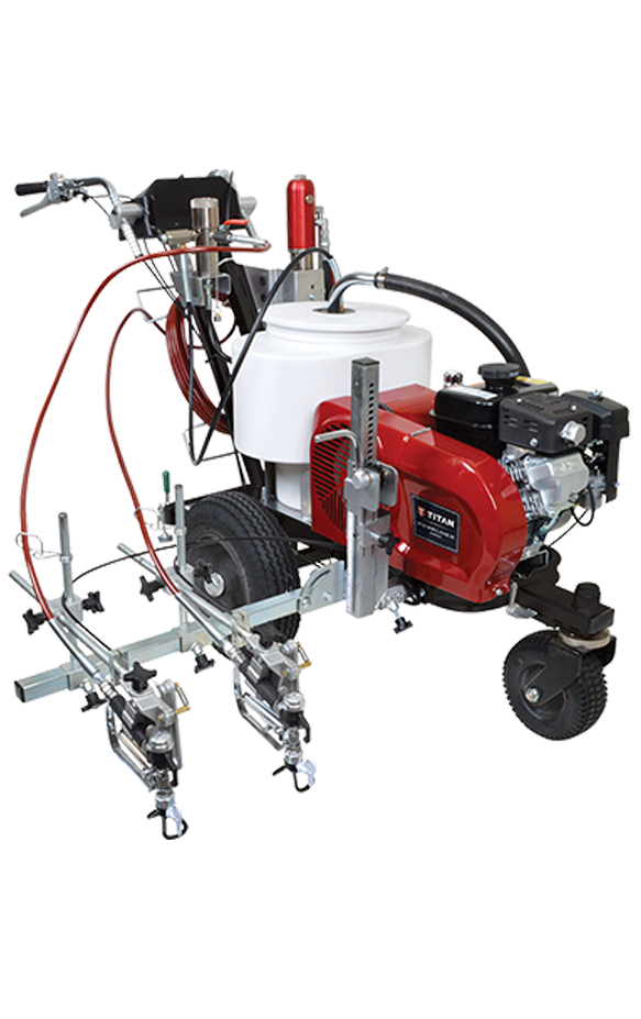 Equipo pintarrayas para campos deportivos y estacionamientos, compatible con pinturas base agua o solvente.